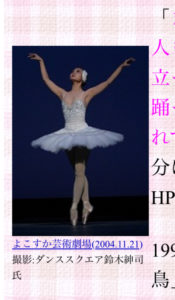 私は1974年2月(8歳)からバレエを学びました。1980年の発表会では「白鳥の湖」で憧れのオデット姫は踊れませんでしたが2001年2月に横浜市磯子区にあるスタジオを借りJUNバレエスクールを開設。2003年 バレエ&舞踊フェスティバルで「白鳥の湖」第2幕を踊ることができました。結婚後もプロのダンサーさん達が出演する舞台にも出演。2005年 ABC FACTORY 「ゆうづる」。2007年は骨髄バンクチャリティーコンサートに2月 目黒パーシモンホール。4月 神奈川県民ホール。8月 宮城県民ホール。やっと生まれ故郷 仙台でも、「瀕死の白鳥」を踊ることができました。私がマイヤ・プリセスカヤさんの踊る「瀕死の白鳥」を見た宮城県民ホールで踊られたことに感謝しています。