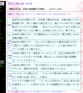 ブログには「瀕死の白鳥物語」の他に思い出の谷桃子バレエ団・研究所発表会のことや、多胡版「くるみ割り人形」、瀕死の白鳥に憧れて、エリアナ・パブロワ、ダンスカナガワフェスティバル、バレエ「鷺娘」について書いている。