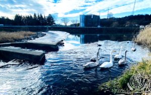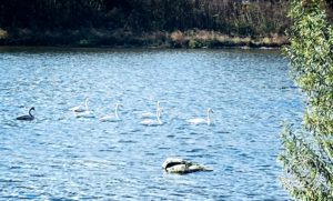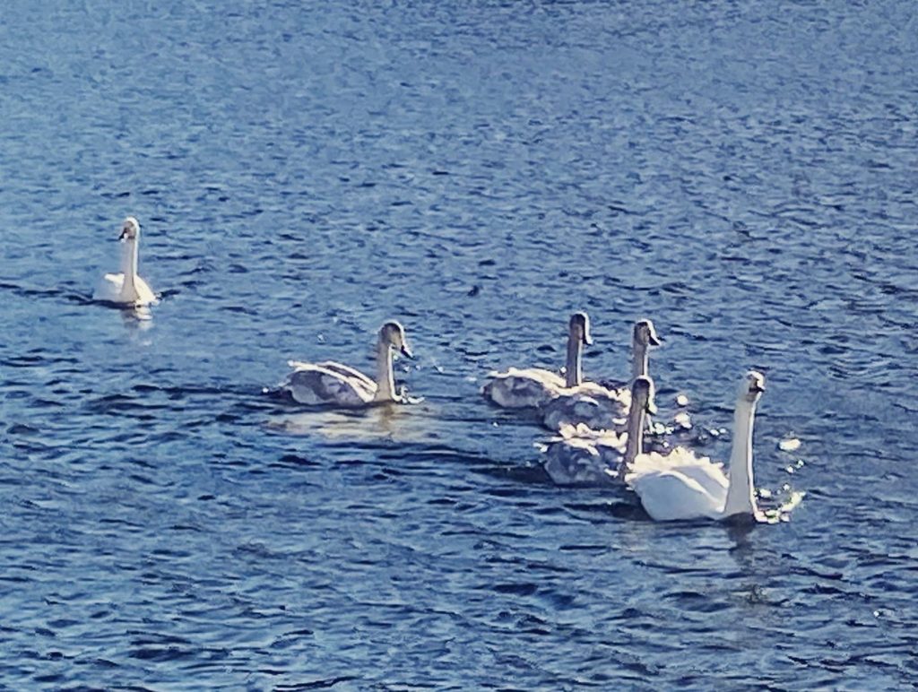 朝ご飯をいっぱい食べて、川の中央に7羽の白鳥いる。