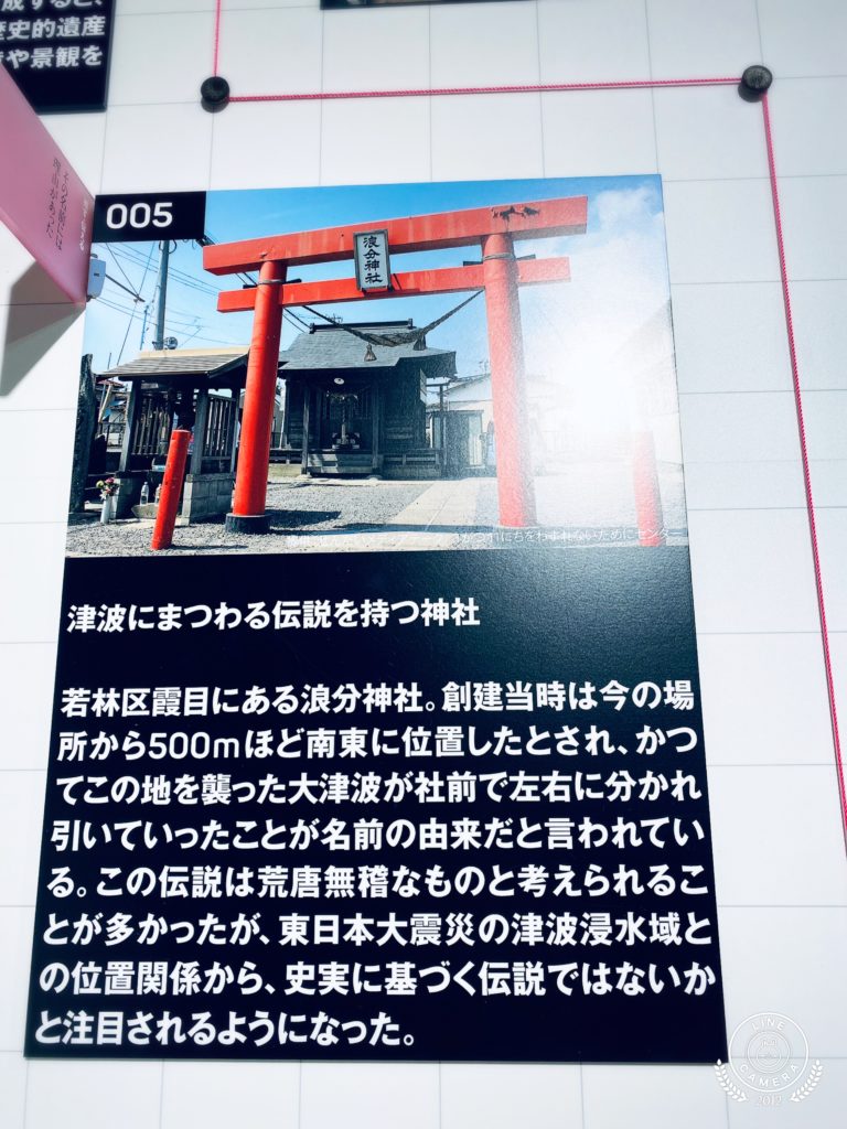 仙台市若林区霞目にある浪分神社、建立当時は現在の場所から500メートルほど南東の、今より海岸に近い場所にあったそうです。この神社は稲荷神社として建立された後、神社近くまで大津波に襲われたものの社前で波が二つに分かれて引いていき、それ以来波(浪)が分かれた神社、すなわち「浪分神社」の名で呼ばれるようになったという伝承があります。