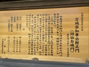 この門は、もともと大正9年(1920年)に解体された仙台城中門(寅門)の部材を使用して、当時第二師団長官舎であった現在の場所に移築したと伝えられています。